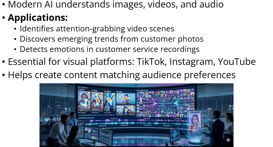 A major trend in AI today is something called “multimodal AI.” Earlier AI systems mostly understood text, but modern AI can understand images, videos, and audio as well. This is extremely helpful for marketers because so much online content is visual.