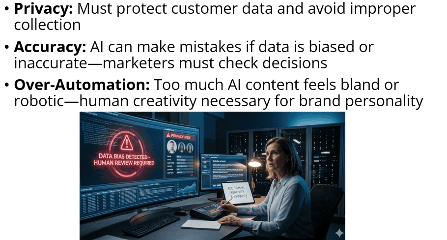 Even though AI offers many benefits, it also creates some challenges. Because AI relies on data, companies must protect customer privacy and avoid collecting information without proper permission. AI can also make mistakes if the data it learned from is biased or inaccurate. That means marketers must check AI’s decisions and make sure they align with fairness and good judgment. Another risk is relying too much on automation. If a brand lets AI generate everything, its content may start to feel bland or robotic. Human creativity is still necessary to give a brand personality and meaning.