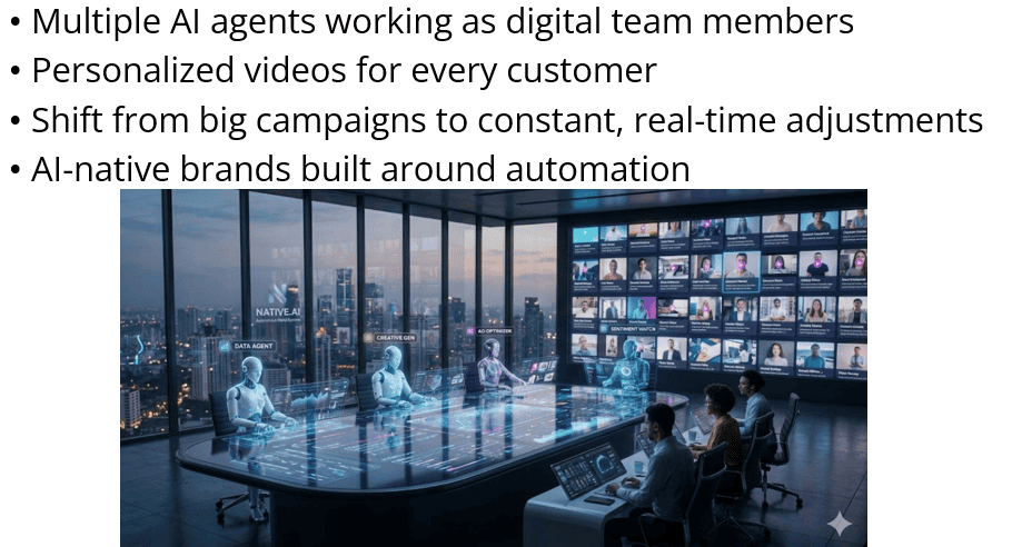 AI is improving quickly, and its role in marketing will become even bigger. In the future, it’s likely that companies will use multiple AI agents that work like small digital team members. One agent might analyze data, another might create images, another might optimize ads, and another might monitor customer reactions. AI will also make personalized videos common, allowing every customer to receive a unique message. Marketing strategies will shift away from a few big campaigns toward constant, real-time adjustments. Even entirely AI-native brands may appear—companies built around automation from the start.