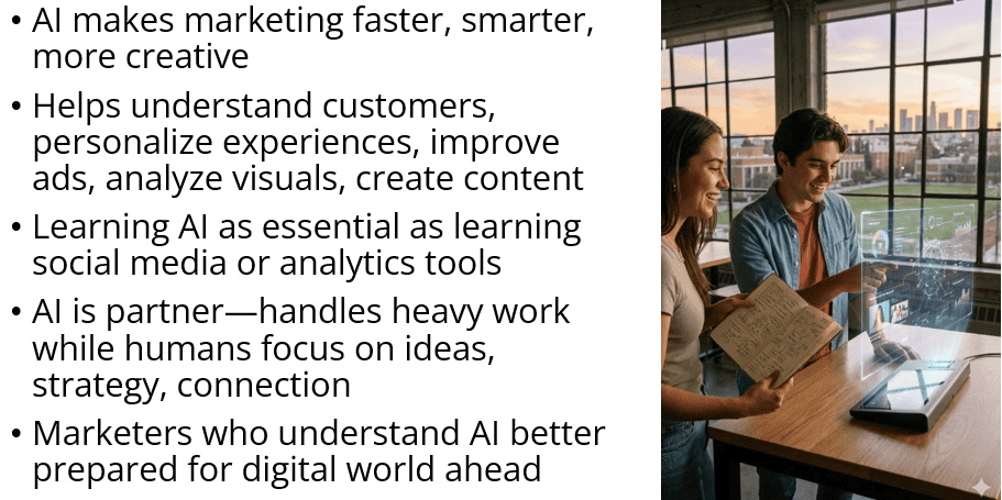 AI is reshaping digital marketing in ways that make the field faster, smarter, and more creative. It helps marketers understand customers, personalize experiences, improve ads, analyze visuals, and create content more efficiently. For students beginning their journey in marketing, learning how AI works is becoming just as essential as learning social media platforms or analytics tools. AI isn’t replacing marketers; it’s becoming a partner that handles the heavy work so humans can focus on ideas, strategy, and connection. As AI continues to evolve, marketers who understand how to use it will be better prepared for the digital world ahead.