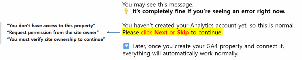 Before connecting GA4, you may see temporary warning messages in Site Kit. This happens simply because your Analytics property has not been created yet. There is nothing wrong with your setup — just proceed by clicking Next or Skip. Once your GA4 property is created and linked, all data will begin to appear normally.