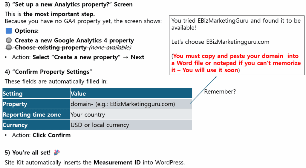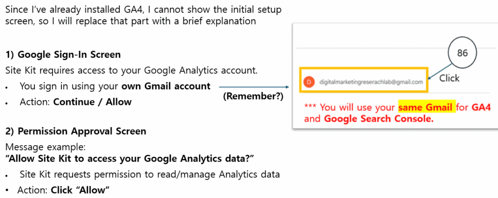Now you will see how to create and connect your GA4 property through Site Kit using your own Gmail account. Be sure to use the same Gmail for both GA4 and Google Search Console, and pay close attention when selecting “Create a new property,” as this step determines your official Analytics setup.